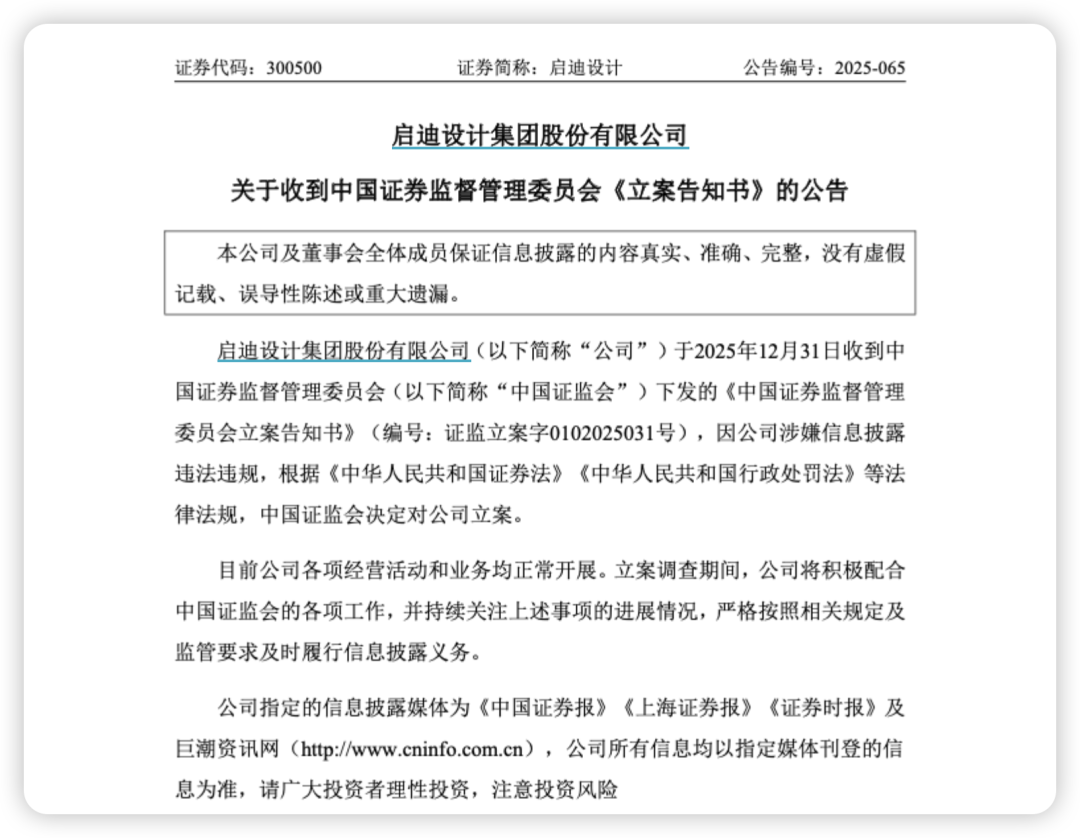 2025年12月31日盘后,启迪设计(300500)(300500)用一纸公司被立案调查的公告,为自己去年的上市之旅画上了一个尴尬的句号。